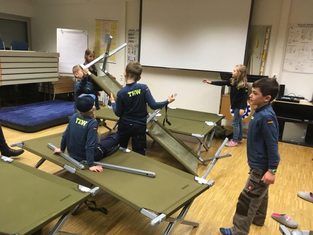 Zum Abschluss der Herbstferien wird es für die Kirchheimer THW-Minis ernst. Gemeinsam mit ihren Betreuern wollen die Minis in ihrem Ortsverband übernachten.Was sich für die meisten als eine banale Sache darstellt “Wir schlafen eine Nacht im Ortsverband Kirchheim unter Teck”, Ist für Minis eine große Herausforderung, schließlich haben noch nicht viele von ihnen eine Nacht ohne die Eltern außerhalb ihres Zuhause verbracht.
