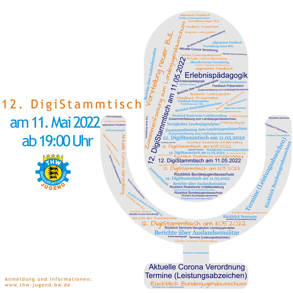 Wir laden Dich hiermit zum 12. DigiStammtisch am 11. Mai 2022 ab 19:00 Uhr ein! Du bist Ortsjugendleiter*in und / oder Ortsjugendbeauftragte*r aus Baden-Württembergoder in der THW-Jugendarbeit aktiv,dann melde Dich zum 12. DigiStammtisch hier und jetzt an! Programm: Corona:Aktuelle Corona Verordnungggf. auch auf überregionale Jugendarbeit Termine:Leistungsabzeichen Feedback:PräsentationAllgemeines FeedbackZusammenfassung zum Landesjugendausschuss Seminare:Rückblick ErlebnispädagogikRückblick Realistische Unfalldarstellung Berichte:Über Auslandseinsätze News aus dem Ländle Angebote und Zeit für Austausch Natürlich gibt es auch wieder aktuelle Informationen zu allen anderen Themenrund um Eure Jugendarbeit. Informationen: Wann geht es los?Mittwoch, 11.05.2022, ab 19:00 Uhr Wo musst Du hin?Wenn Du willst, ganz bequem von Deiner Couch aus oder wo immer Du gerade bist! Was brauchst Du dafür?Alles was Du benötigst ist ein Smartphone, Tablet oder einen PC und einen Internetzugang. Mit uns kannst Du über Deine aktuellen Themen und mehr diskutieren oder auch schweigen und einfach nur zuhören! Sende einfach eine formlose Mitteilung mit dem Betreff „DIGI-Stammtisch“ an unsere Mailadresse für Anmeldungen anmeldung@test2.landeszeltlager.debis spätestens Dienstag, 10.05.2022 um 16:00 Uhr,damit wir Dir den Zugangslink zusenden können.Du erhältst dann auch noch weitere Details zum DigiStammtisch(wie z. B. geeignete Einstellung im Browser etc.) Und dann heißt es erneut:Herzlich Willkommen im DigiStammtisch!